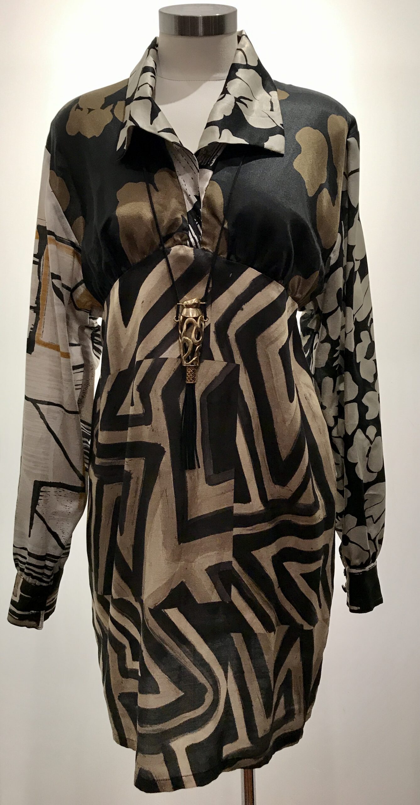 Chemisier froncé à la poitrine en soie. Longueur en haut du genoux. Deux boutonnières sur les poignet. Parfait pour l’automne et le printemps. Peut-être porté avec un leging, un pantalon droit, ou guise de robe.